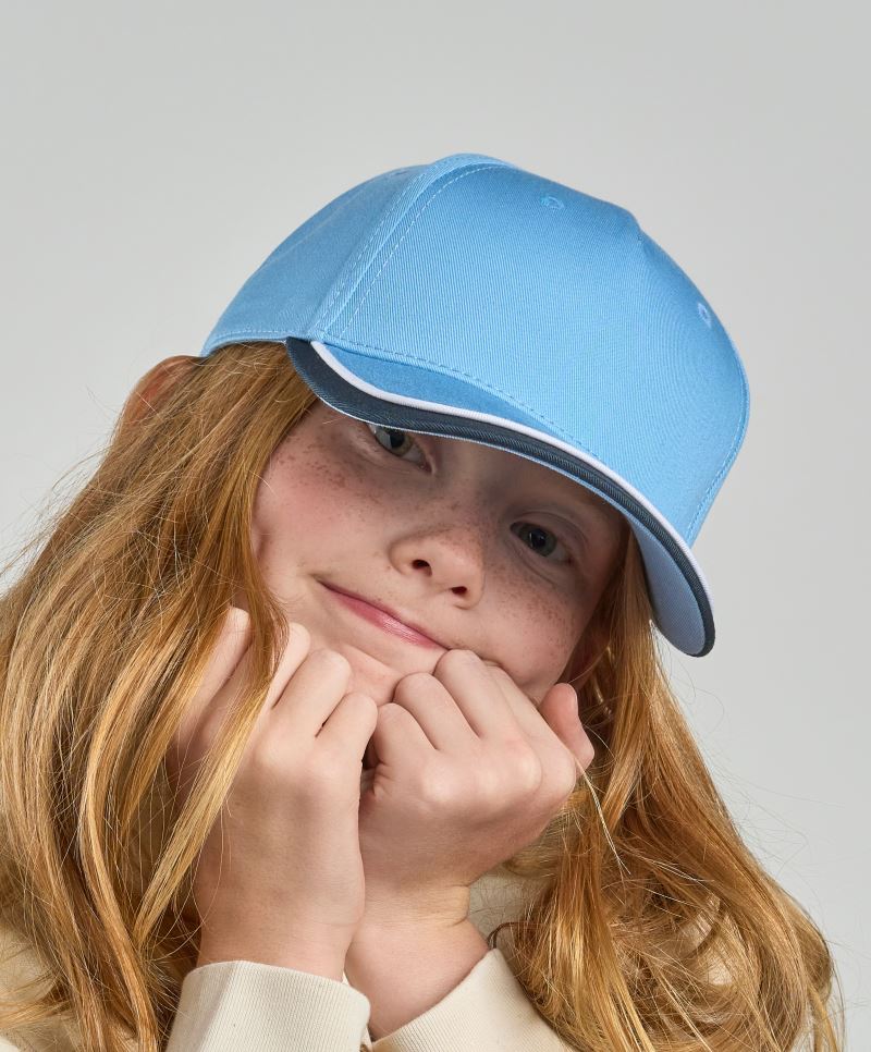 Vorgeformter Schirm, strukturiertes Frontsegment, gestickte Luftlöcher, Snapback, kindersicherer Knopf, Tear Away Label, Umfang: 55-58cm, nicht bügeln, nicht trocknergeeignet, nicht chemisch reinigen