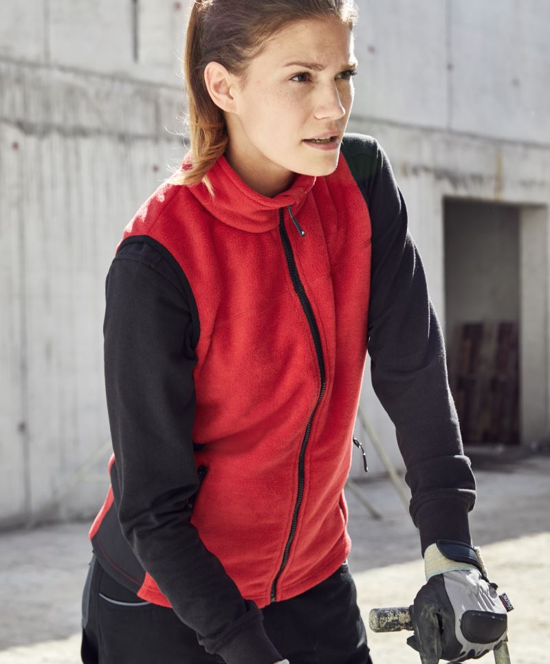 Stehkragen, unterlegter Reißverschluss mit Kinnschutz, 2 Seitentaschen mit Reißverschluss, elastische Softshelleinsätze in Kontrastfarbe an den Seiten, pflegeleichtes Antipilling Microfleece, 30° waschbar, nicht bügeln, trocknergeeignet bei niedriger Temperatur