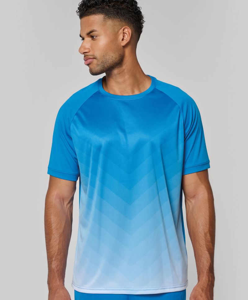 Klassischer Schnitt, Raglanärmel, Doppelnähte am Saum, Vorderseite mit geometrischem Farbverlaufsmuster bedruckt, antistatische Ausrüstung, leichter und angenehmer Tragekomfort, schnelltrocknend, zertifizierte vegane Produktion ohne tierische Hilfsstoffe, Tear Away Label, 30° waschbar