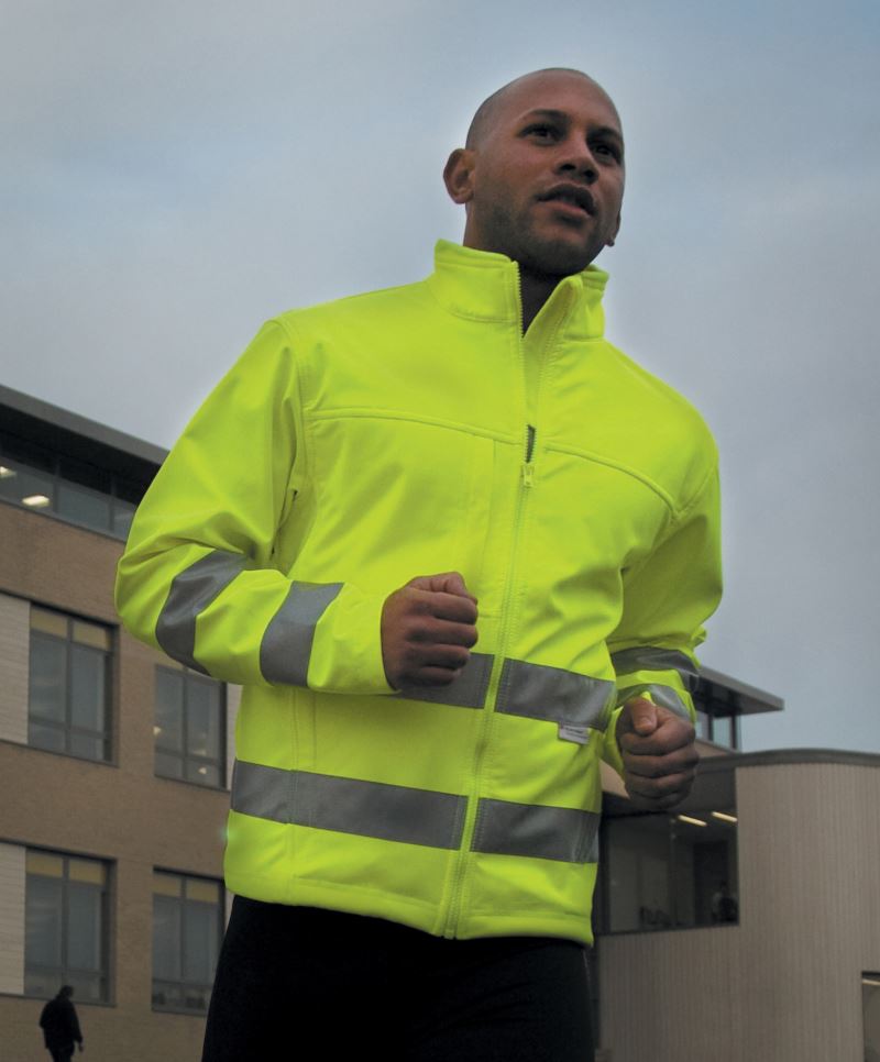 Wärmende Innenseite, winddicht und wasserabweisend (8.000mm Wassersäule), atmungsaktiv (3.000g/m² in 24h), Stehkragen, dunkle schmutzunempfindliche Einsätze an Bund- und Ärmelabschluss, verstellbare Ärmelbündchen mit Klettverschluss, durchgehender Reißverschluss mit Kinnschutz, 2 Seitentaschen und 1 Brusttasche mit Reißverschluss, länger geschnittener Rücken, Aufhänger, spezielle Garnstruktur ohne Elasthan für gute Bedruckbarkeit und Elastizität, zertifiziert nach EN ISO 20471:2013+A1:2016 Klasse 2, gut bedruckbares Softshellmaterial, wiederverwertbar am Lebensende, aufgedruckte Reflexstreifen, neutrales Größenlabel, 40° waschbar, nicht trocknergeeignet