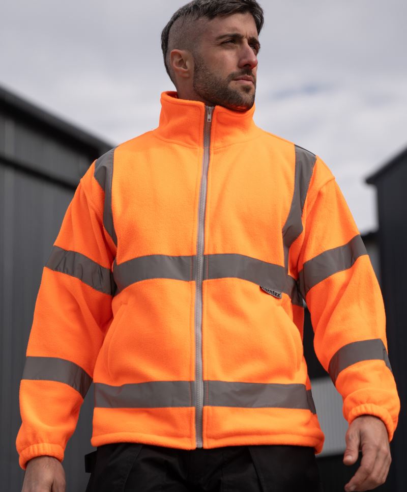 Stehkragen, elastische Bündchen an Arm- und Bundabschluss, durchgehender Reißverschluss vorne, 2 Seitentaschen, zertifiziert nach EN ISO 20471:2013 Klasse 3, garantierte Reflektionseigenschaft gemäß EN-Norm für 25 Waschgänge, 2 Reflexstreifen an Ärmeln, je 1 Reflexstreifen über jeder Schulter, zwei 5cm breite Reflexstreifen um den Körper, 40° waschbar