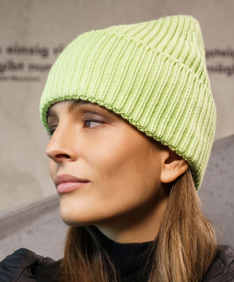 Risvolto, maglia grossa, etichetta a bandiera "poliestere riciclato" all'interno, etichetta TearAway, lavaggio manuale, no Stiro, non adatta all'asciugatrice, non lavare con trattamento chimico