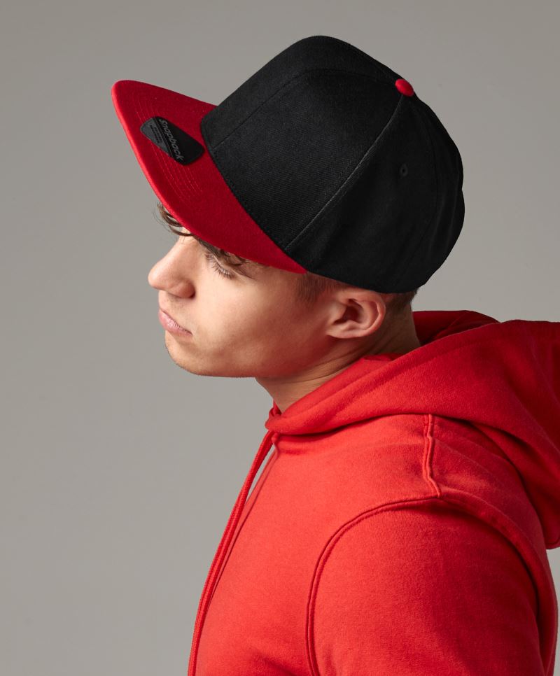 Modello sostenibile successivo al Snap Back (articolo: 33.2080), visiera piana, Buckram riciclato, Fascia tergisudore in twill di poliestere riciclato, pannelli frontali laminati, fori per l'aria ricamati, chiusura Snap riciclata, etichetta TearAway, lavaggio manuale, no Stiro, non adatta all'asciugatrice, non lavare con trattamento chimico