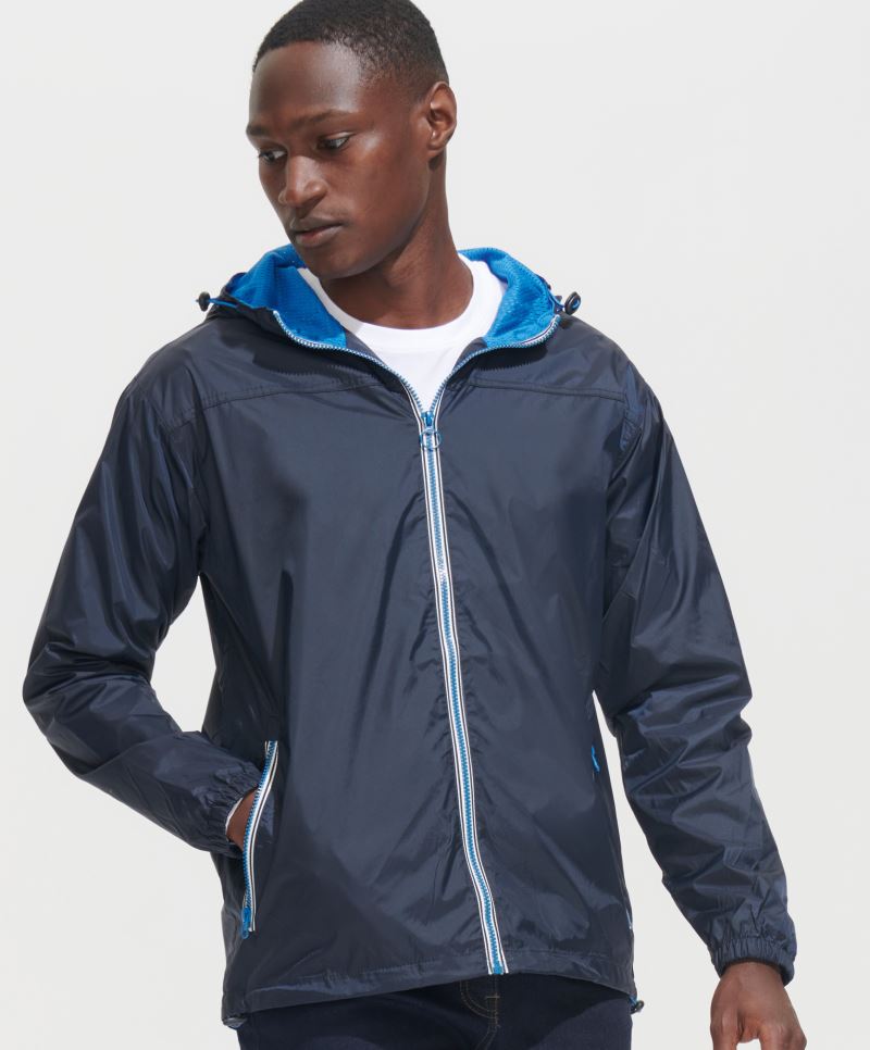 Idrorepellente, colletto con cappuccio integrato, cordoncino al colletto e sul polsino, cerniera lampo coperta con zip in colore a contrasto, accesso di finitura sulla schiena, tasca laterale destra con sistema K-Way per deporre la giacca, lavabile a 30°, no Stiro, non adatta all'asciugatrice