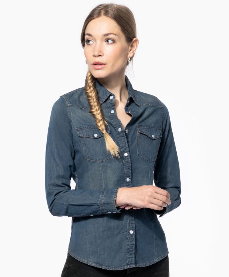 Colletto femminile con linguetta di grandi dimensioni sul primo bottone e miniadesivo in denim lavorato sul lato sinistro, parte posteriore del colletto composta di due parti, abbottonatura con cucitura a zigzag tono su tono, sprone della spalla con 2 imbottiture davanti sulla spalla, polsino a 2 bottoni, bottoni tono su tono, bottone aggiuntivo in ottone antico sul polsino sinistro, pincia sul petto e sulla schiena, tassello in colore a contrasto sull'orlo laterale della blusa