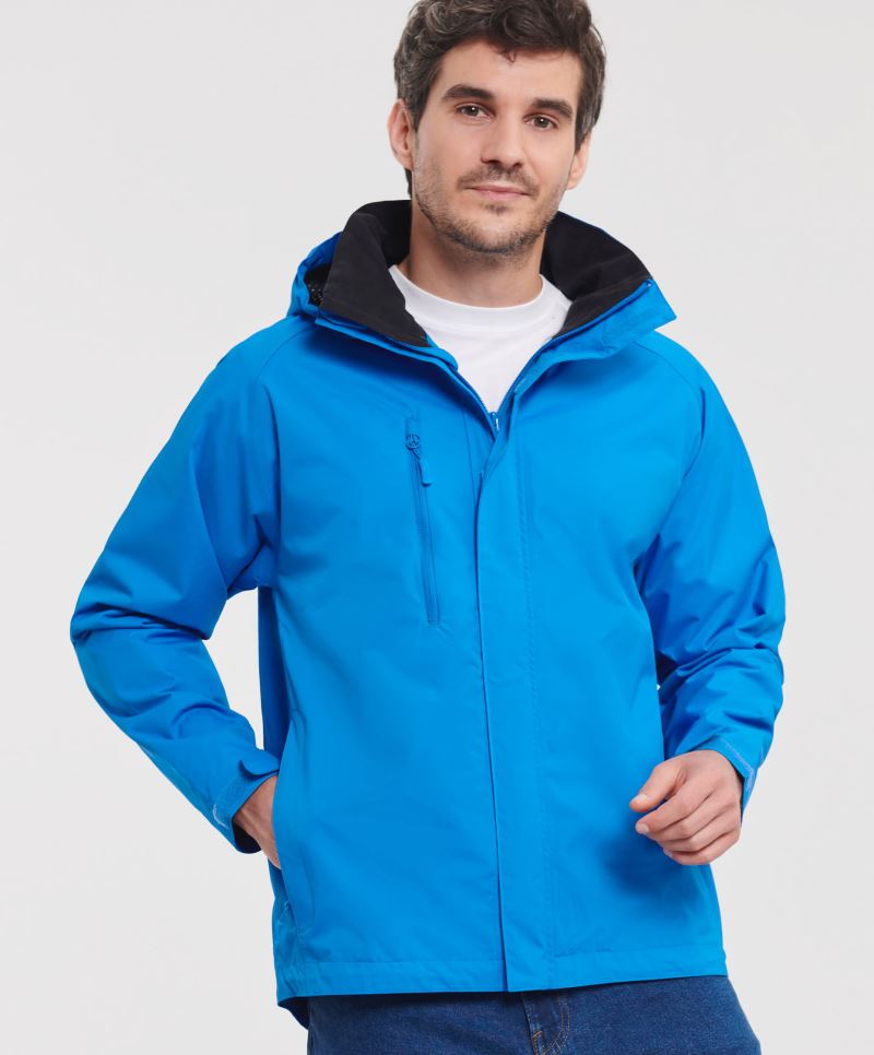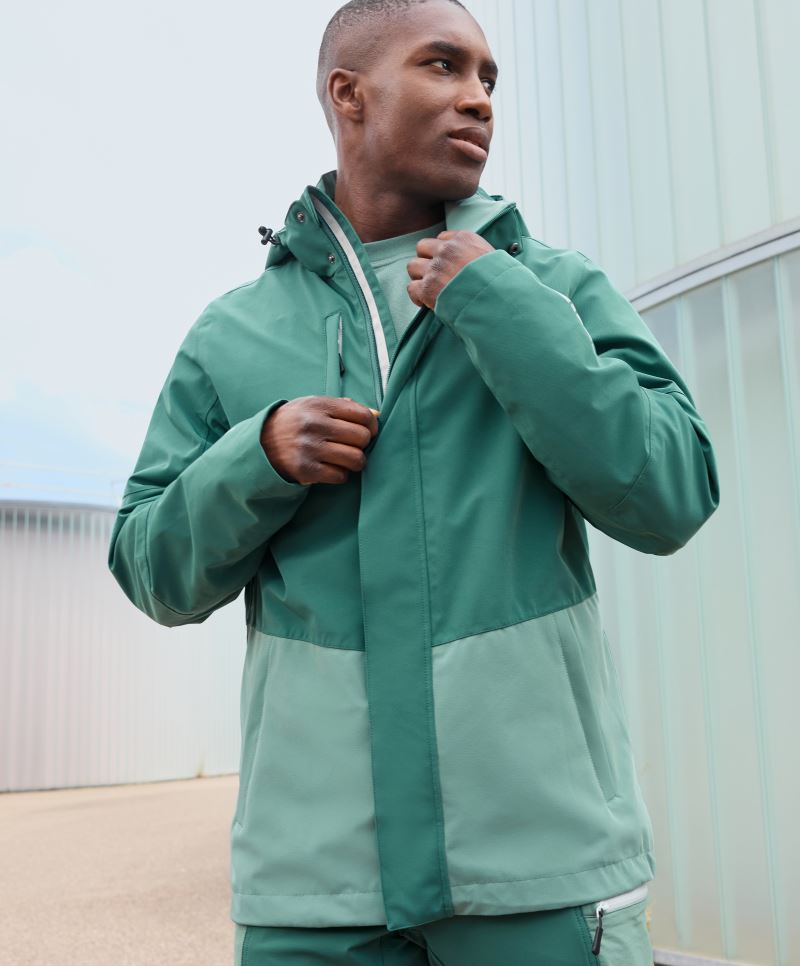 Taglio classico, resistente al vento e idrorepellente (colonna d'acqua di 3.000 mm), traspirante (3.000 g/m² in 24h), cappuccio riponibile, 2 tasche laterali con cerniera, cuciture sigillate, Sviluppato per allenarsi in condizioni di bagnato, morbida fodera in rete, a regolazione d'umidità, lavabile a 40°, non adatta all'asciugatrice