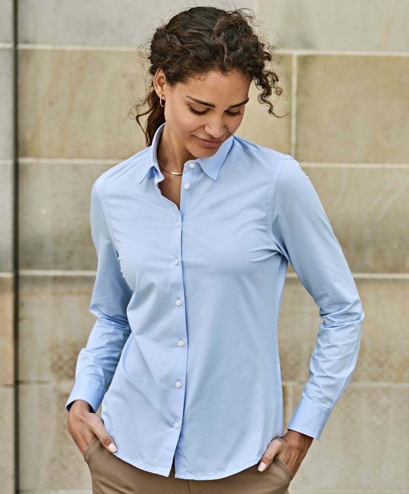 Vestibilità sfiancata, colletto piccolo morbido, carré a doppio strato su spalle e schiena, orlo arrotondato, bottoni tono su tono, cuciture alla viennese, lavabile a 30°, Easy Care, biancheria delicata, non adatta all'asciugatrice