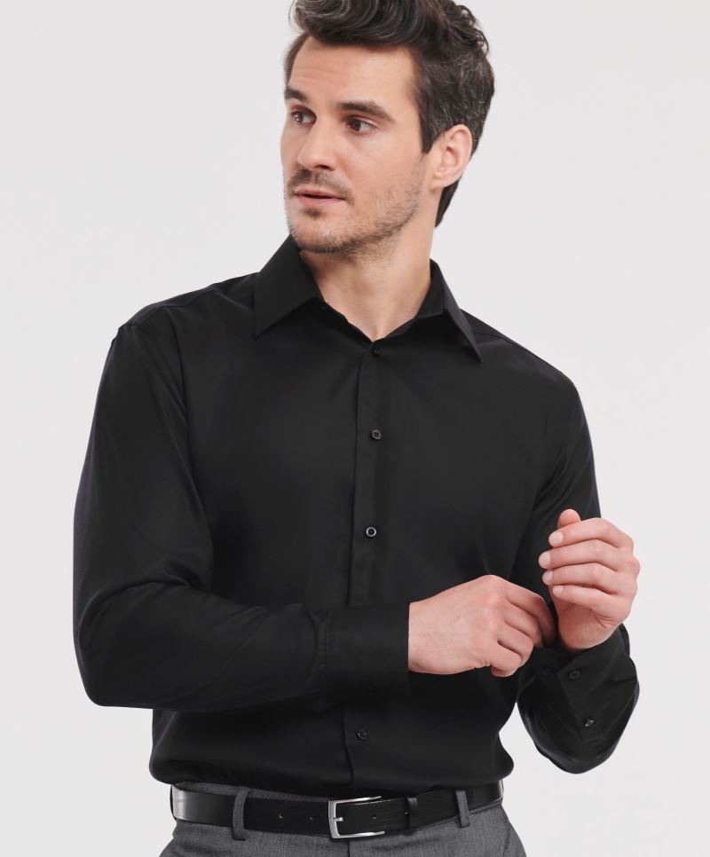 Taglio Slim Fit, mezzo colletto Cutaway, carré sulle spalle e sul retro, polsini regolabili con 2 bottoni, 35mm di larghezza, abbottonatura rinforzata, cuciture principali saldate, pincia sulla schiena, in cotone a fibra lunga, lavabile a 40°, non adatta all'asciugatrice, trattamento brevettato ecologico senza stiratura