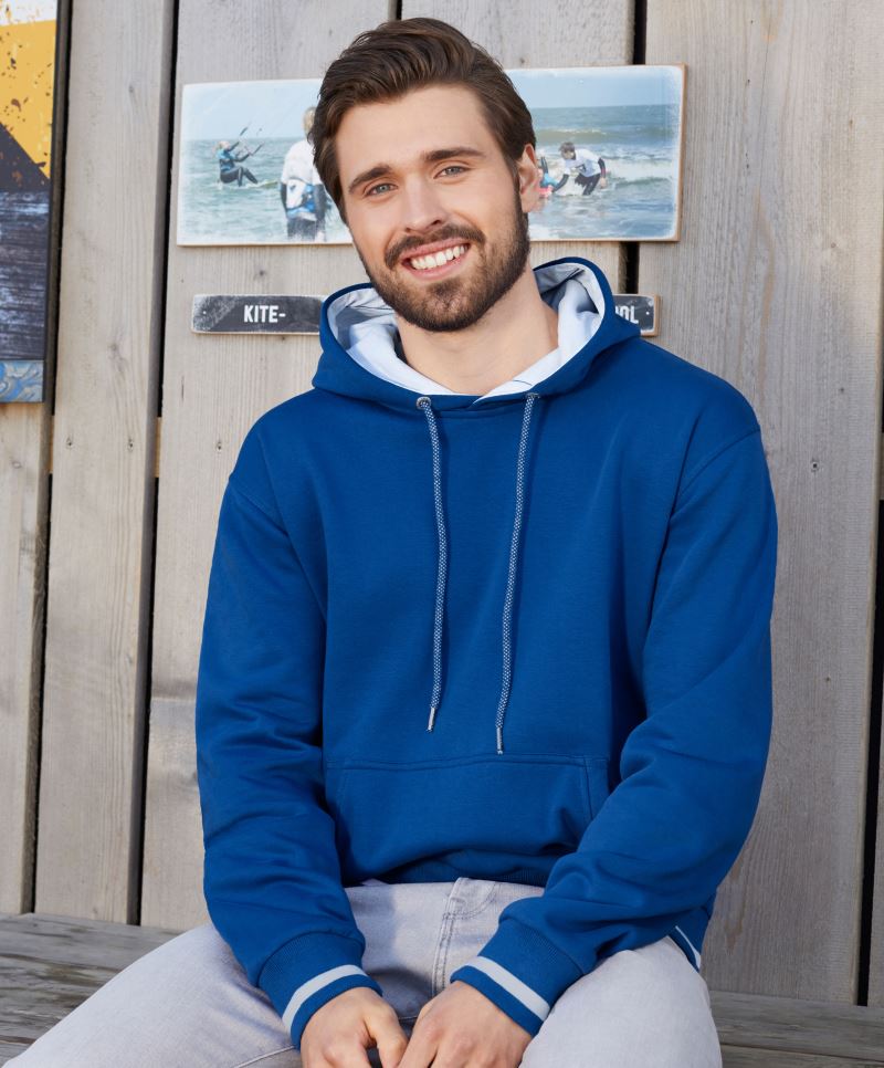 Cappuccio a 2 all'interno in colore a contrasto, bordini a maglia con elastan, cerniera lampo di metallo YKK, tasca a marsupio, strisce in colore a contrasto su polsini delle maniche e bordo, spazzolato all'interno, lavabile a 30°, biancheria delicata, adatta all'asciugatrice a temperatura bassa