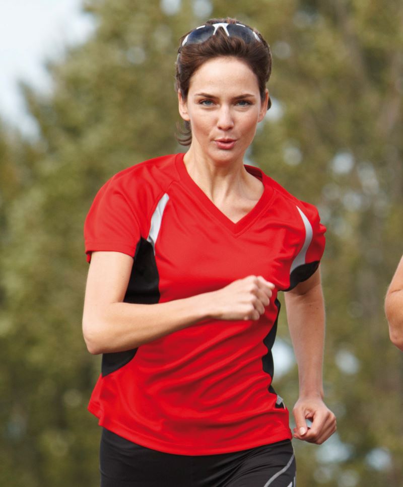 Taglio diritto, scollatura a collo rotondo con fascia del colletto, doppie cuciture su maniche e bordini, maniche, spalle, schiena e fronte con nastro in sbieco in colore a contrasto, leggero e ad asciugatura veloce, etichetta TearAway, lavabile a 40°, non adatta all'asciugatrice