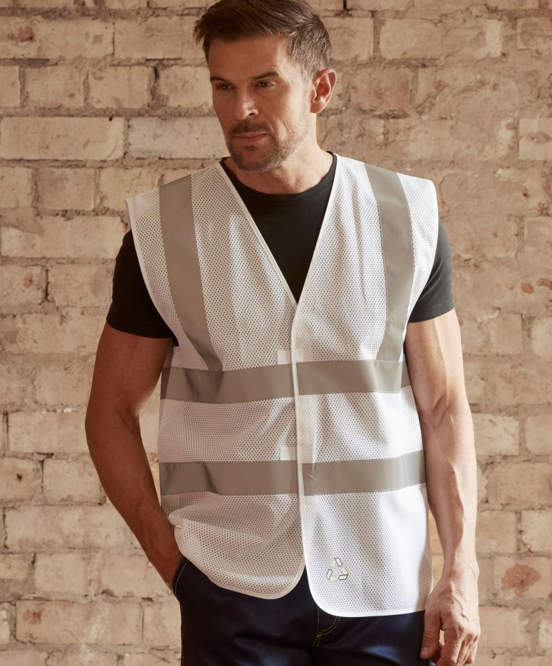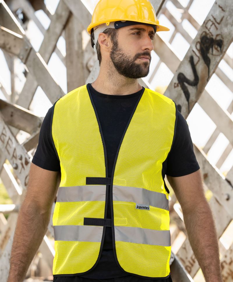 Molto traspirante, orlato con orlatura in poliestere nera, regolazione della grandezza tramite 2 chiusure a strappo, ideale per i luoghi di lavoro caldi, certificato secondo EN 17353 tipo B3 (buio), strisce riflettenti larghe due 5 cm attorno al corpo (senza funzione protettiva)