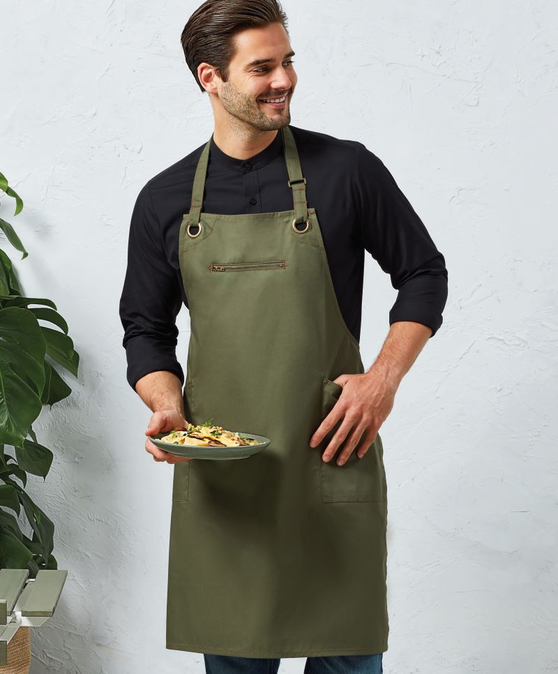 Prodotto in materiale denim riciclato, fascia del colletto con nodo per la regolazione della lunghezza, 2 tasche laterali, misure della tasca: 23x17,5 cm, cuciture in colore a contrasto, nastri di stoffa: 90 cm di lunghezza, lunghezza: 86 cm, larghezza: 72 cm, lavabile a 60°, non adatta all'asciugatrice