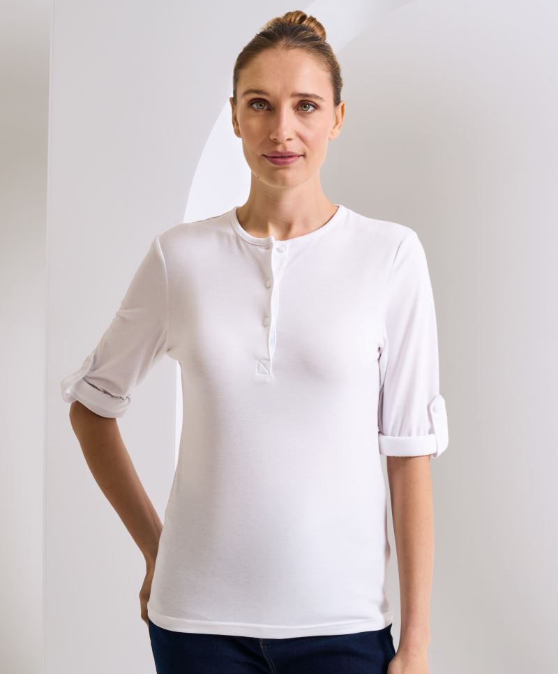 Scollatura a collo rotondo con 3 bottoni, maniche avvolgibili da fissare con bottone e fissaggio, bordini delle maniche e polsini in maglia a coste, Easy Care, lavabile a 40°, non adatta all'asciugatrice