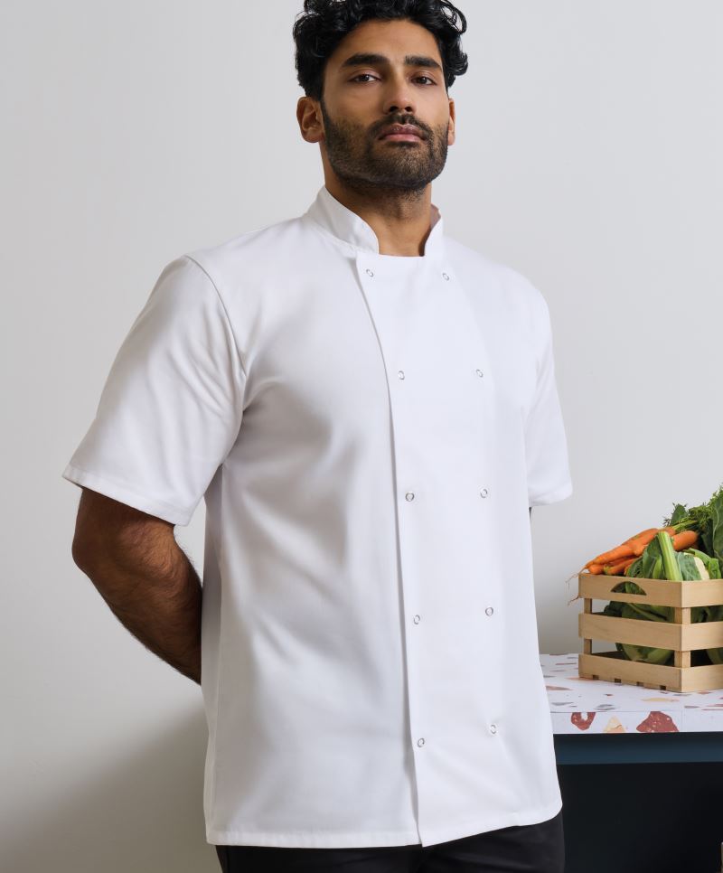 Traspirante e con regolazione dell'umidità, collo alla coreana, chiusura a sovrapposizione con 10 bottoni in tessuto, tasca portapenna sulla manica, inserto a rete sulla schiena, lavabile a 60°, lavabile a lavaggio industriale a 85°, adatta all'asciugatrice a temperatura bassa