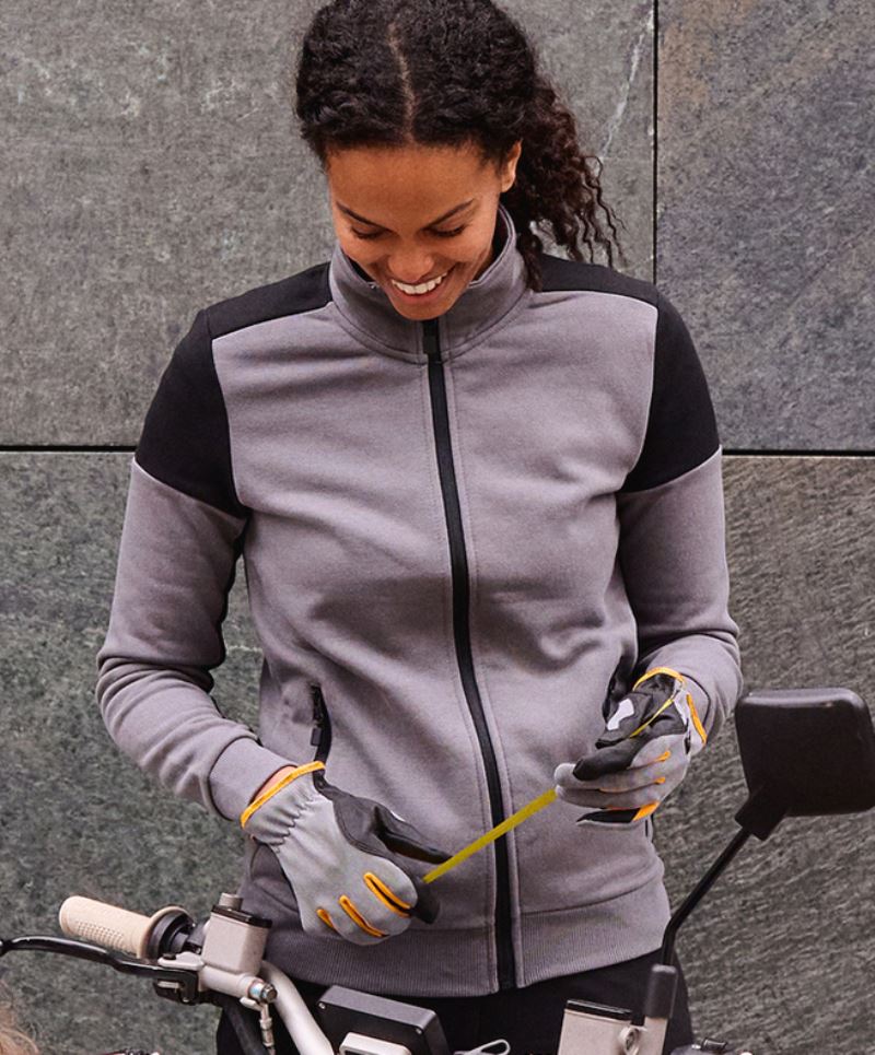 Colletto alla coreana, fascia del colletto in colore a contrasto, bordini delle maniche e polsino in maglia a coste 2x2 con elastan, 2 tasche laterali con cerniera lampo, contrasto cromatico su spalle, interno maniche e cerniere, spazzolato all'interno, lavabile a 60°, adatta all'asciugatrice a temperatura bassa, non lavare con trattamento chimico, adatto al lavaggio industriale, tasca per cucire un chip per il bucato nella cucitura laterale