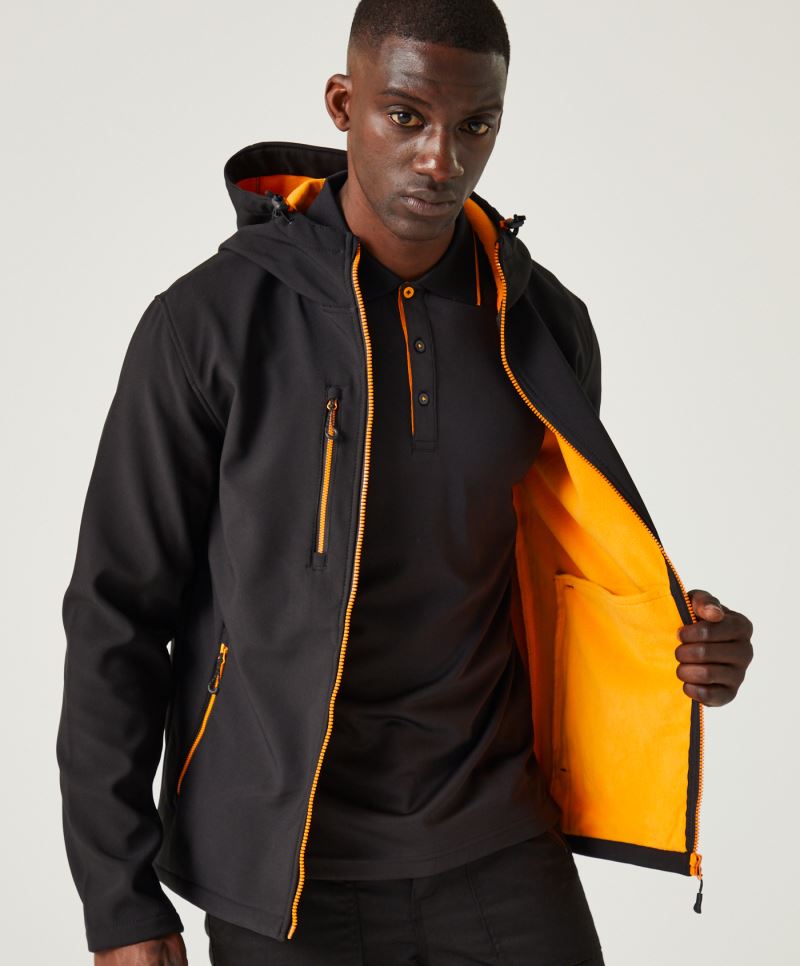 Inserti elastici su cappuccio, maniche e parti laterali, equipaggiamento idrorepellente, cerniera con protezione per mento, tasca pettorale, 2 tasche laterali con cerniera, elevata vestibilità grazie ad inserti elastici sui, adatta all'asciugatrice a temperatura bassa, non lavare a secco