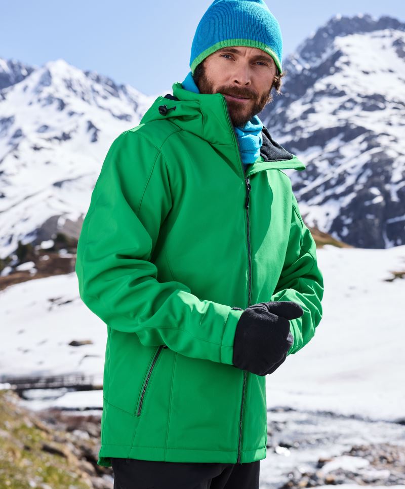 Resistente al vento e idrorepellente (colonna d'acqua di 8.000 mm), traspirante (1.000 g/m² in 24h), cappuccio integrato, finitura maniche elastica con buco per pollice, patta antivento, cerniera con protezione per mento, 2 tasche laterali e 1 tasca pettorale con cerniera, schiena con taglio più lungo, asola per appendere, materiale molto morbido, materiale softshell adatto alla stampa, etichetta con le misure neutra, lavabile a 40°, non adatta all'asciugatrice