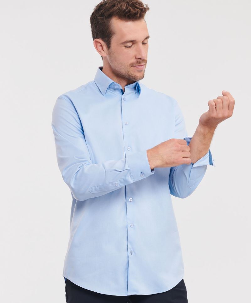 Taglio più lungo, vestibilità sfiancata, mezzo colletto Cutaway, colletto a forma corta, sottile abbottonatura, coprente, Easy Care, lavabile a 40°, adatta all'asciugatrice