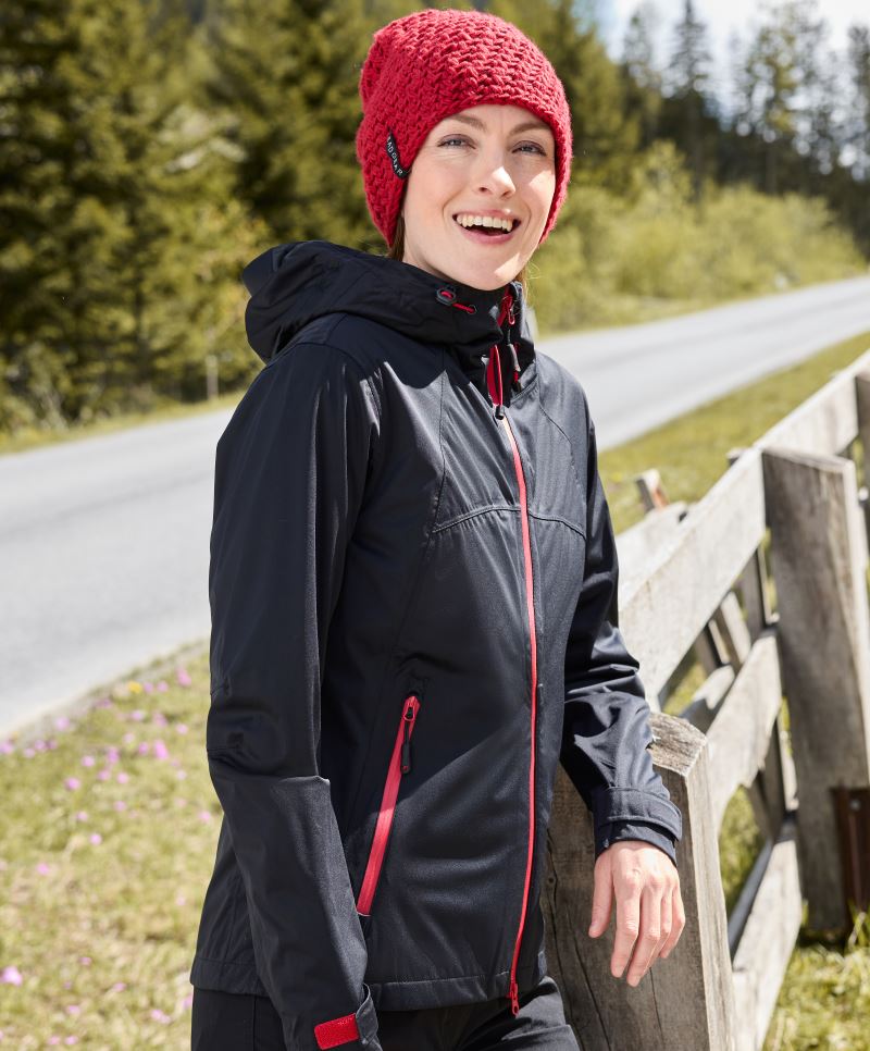 Idrorepellente (colonna d'acqua di 5.000 mm), traspirante (1.000 g/m² in 24h), cappuccio regolabile rimovibile, orlo regolabile, bordini delle maniche regolabili con chiusura a strappo, cerniere lampo SBS, tasca interna destra, mezzaluna sulla schiena per la finitura, etichetta TearAway, etichetta con le misure neutra, lavabile a 40°, biancheria delicata, no Stiro, non adatta all'asciugatrice, pulizia chimica con un solvente qualsiasi ad eccezione del tricloretilene