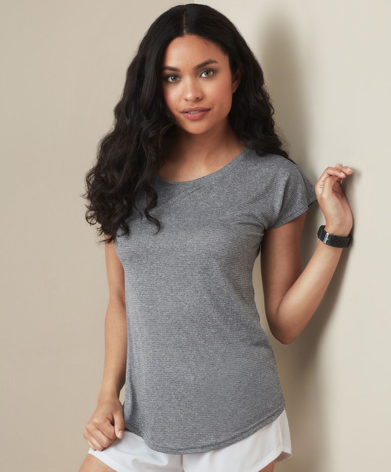 Taglio stretto in vita, colletto con orlatura dello stesso materiale, cuciture piatte in colore a contrasto, in parte prodotto con bottiglie PET riciclato (4 per maglietta), materiale funzionale rispettoso dell'ambiente, aspetto Melange, elementi riflettenti (senza funzione protettiva) davanti e dietro, etichetta TearAway sulla cucitura laterale, etichetta con le misure neutra, biancheria delicata, lavabile a 40°, non adatta all'asciugatrice, non lavare con trattamento chimico