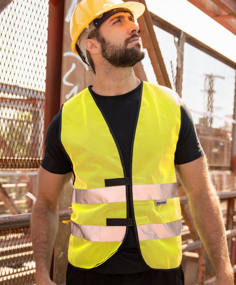 Materiale leggero e traspirante, chiusura a strappo, proprietà riflettenti garantite per 25 lavaggi, secondo la normativa EN, colori Hi-Vis certificati secondo EN ISO 20471 Classe 2, 1 striscia riflettente su ciascuna spalla, due strisce riflettenti larghe 5 cm intorno al corpo, lavabile a 40°